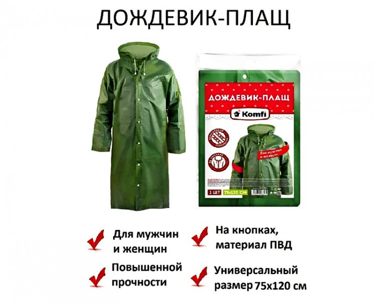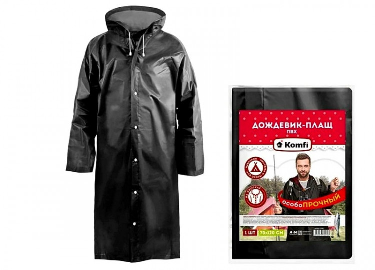 Дождевик-плащ, сверхпрочный на кнопках, ПВХ, черный, Komfi 70*120смВойдите, чтобы увидеть ценуВойдите для просмотра остатковКУПИТЬ