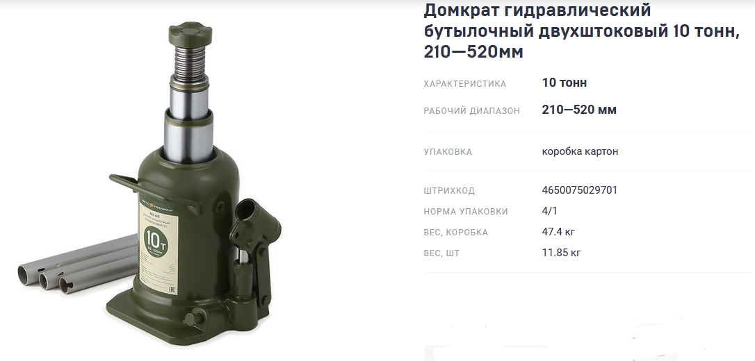 Домкрат гидравлический бутылочный двухштоковый 10 тонн, 210—520 мм "ДТ"Войдите, чтобы увидеть ценуВойдите для просмотра остатковНет в наличии