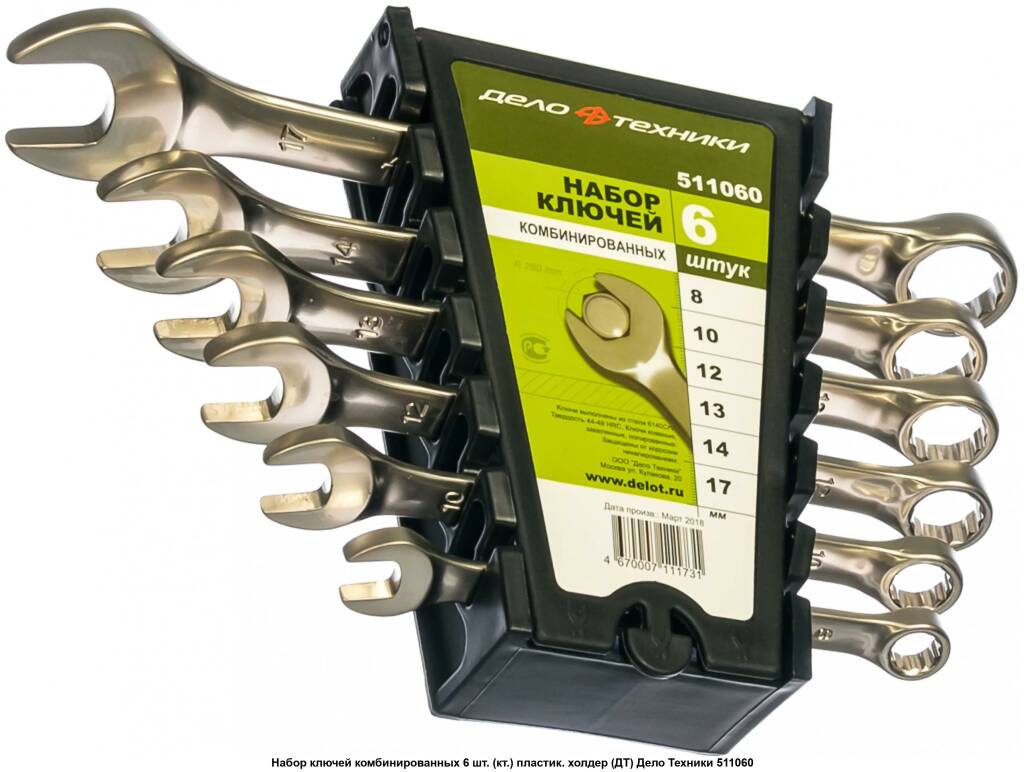 В состав набора входят ключи следующих размеров: 6, 8, 10, 12, 13, 14, 17, 19 мм.